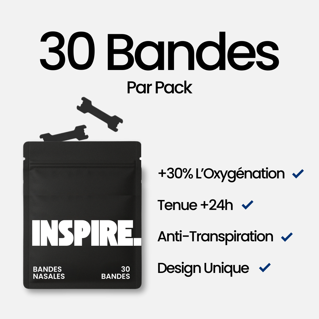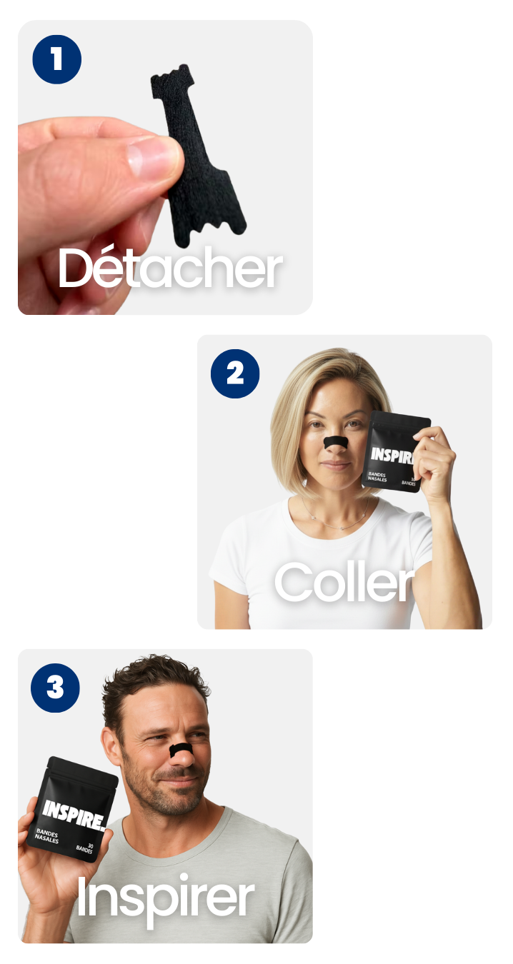 Les bandes nasales Inspire soulèvent en douceur les ailes du nez pour ouvrir les voies respiratoires : jusqu’à +30 % de flux d’air, respiration plus régulière et sommeil plus profond. Effet immédiat sur la sensation d’encombrement et le confort nocturne.