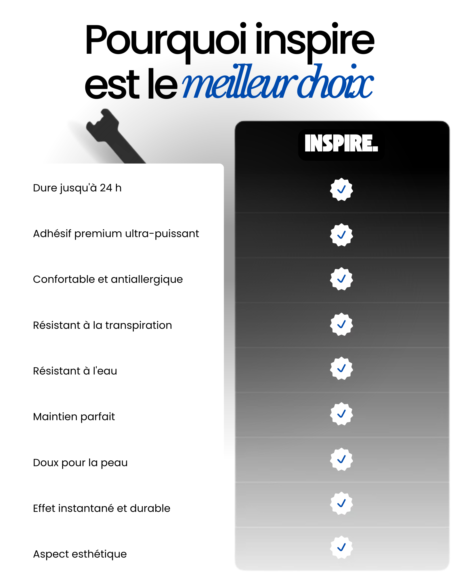 Ce n'est pas une simple bande de pharmacie. Les bandes Inspire sont conçues pour résister à la transpiration, au HIIT, au sommeil et aux entraînements intenses. Notre adhésif a été testé et validé par les meilleurs athlètes.