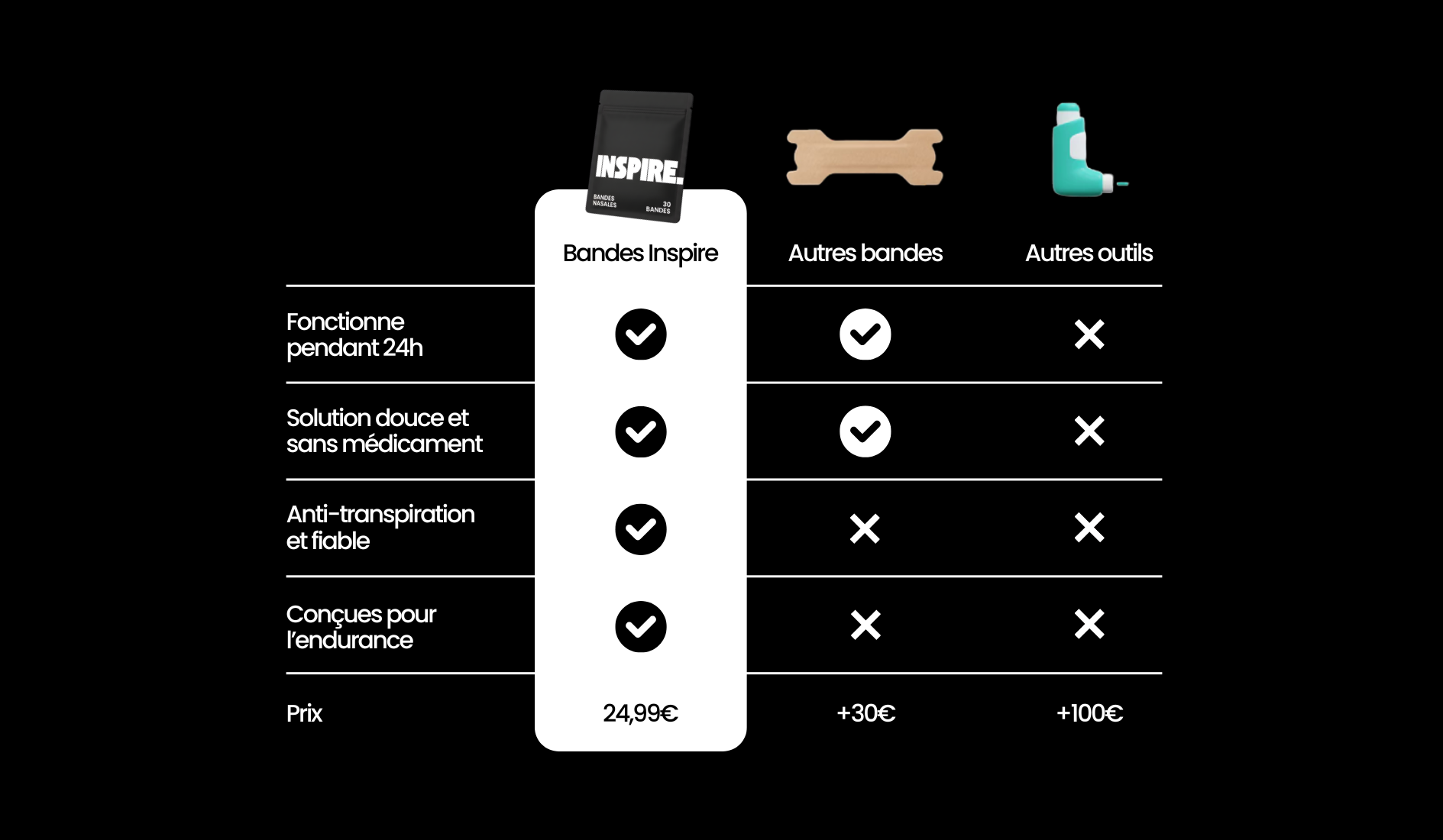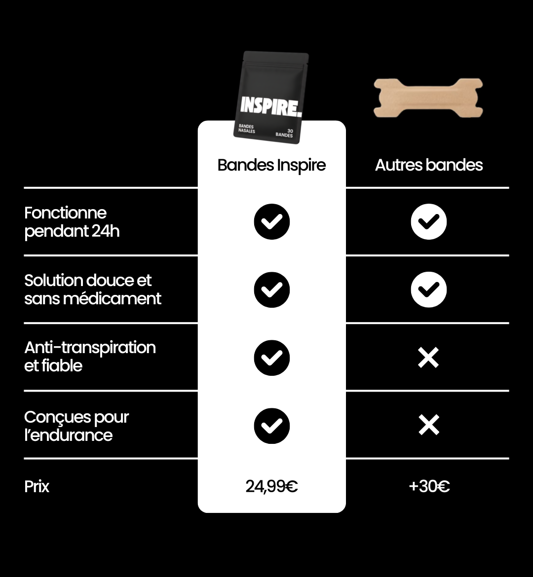 Les bandes nasales Inspire sont conçues pour optimiser la respiration nasale pendant l’effort et la récupération.